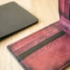 Interior: piele naturala vegetal tabacita, model Pueblo mov si captuseala neagra, prevazut cu 1 compartiment pentru bancnote, 2 compartimente pentru CI si 6 compartimente pentru carduri.