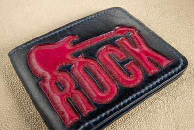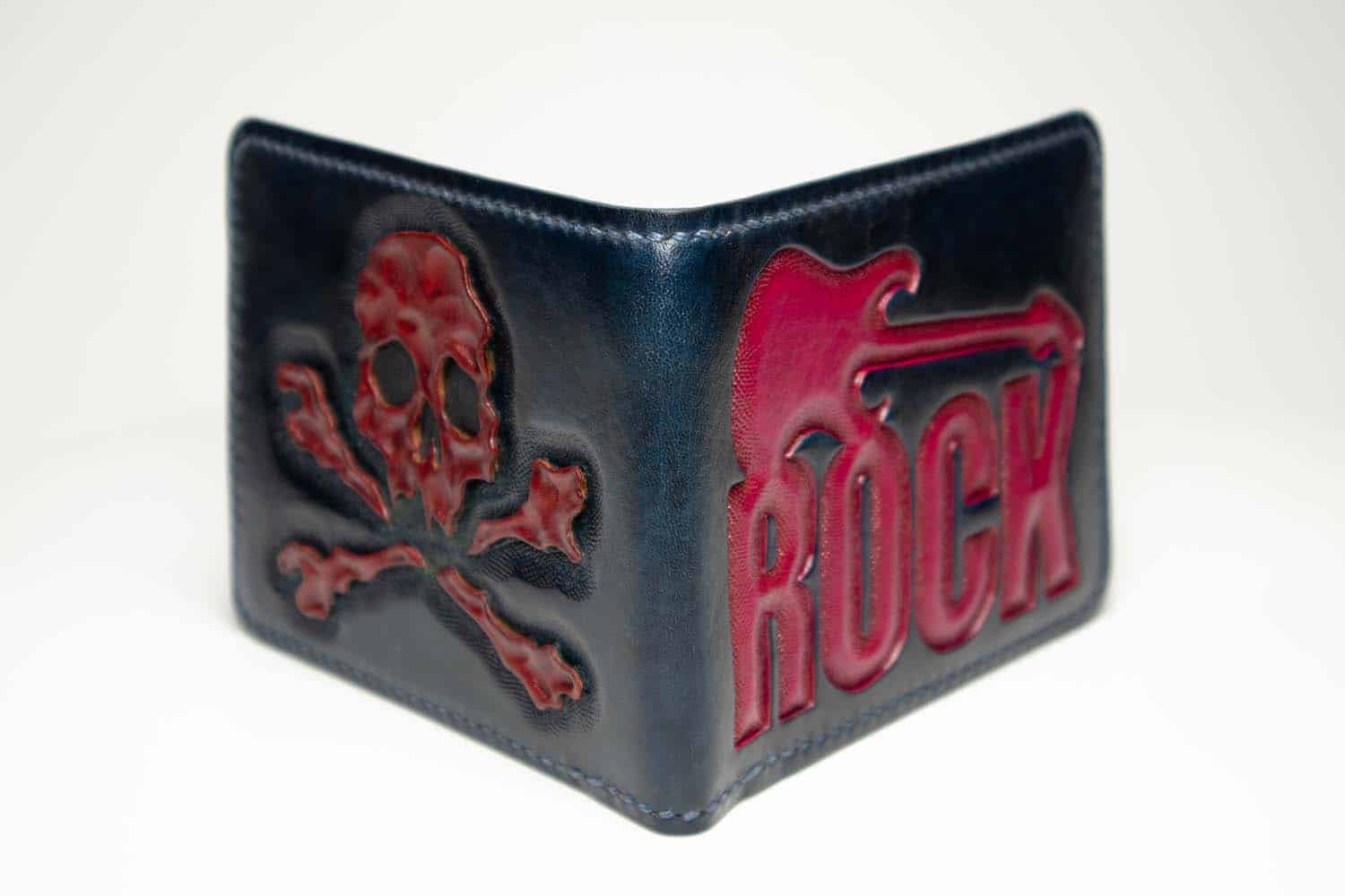 Portofel sculptat Rock and roll si Skull bleu, crom albastru